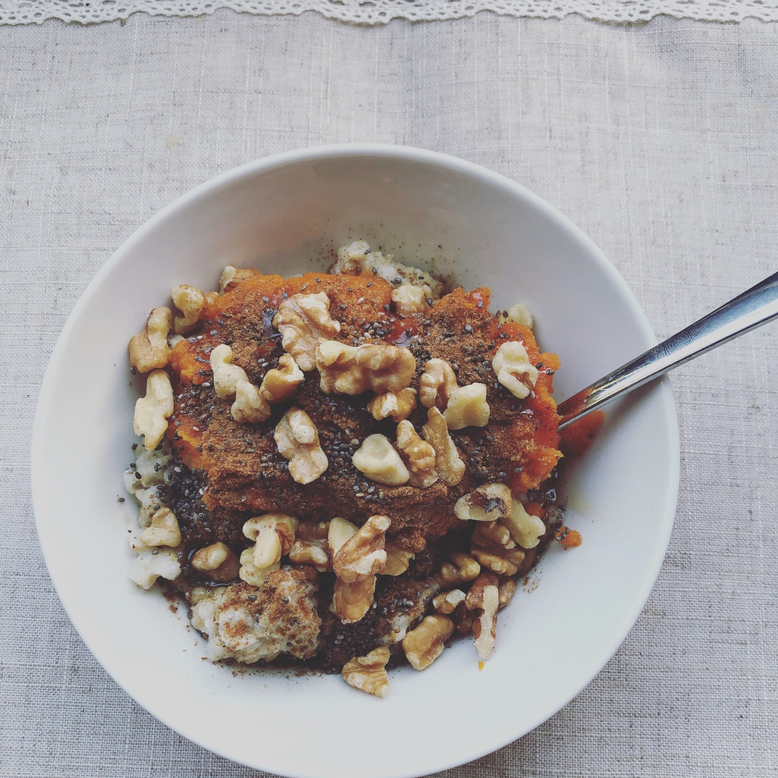 Pumpkin puree with maple syrup, pumpkin pie spice & walnuts